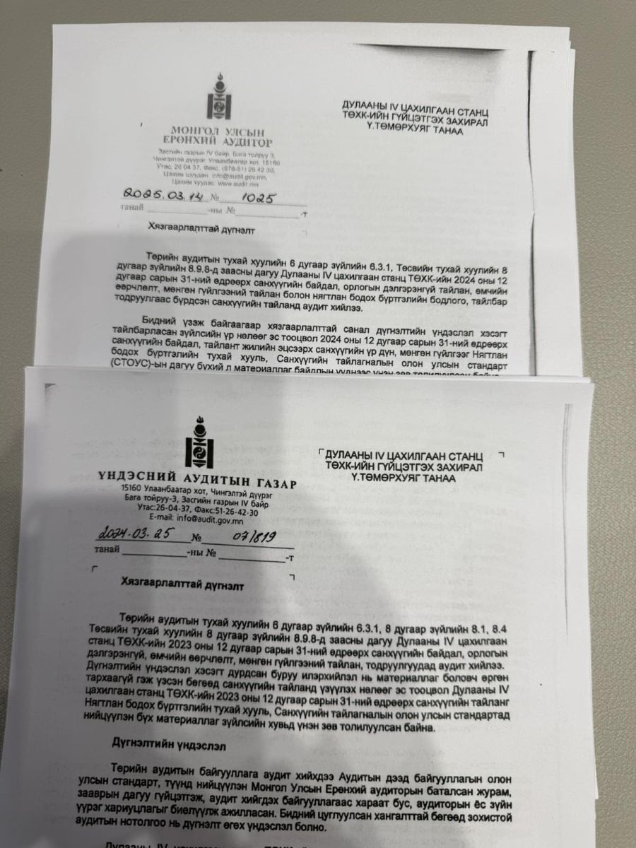 Дараа жилүүдэд нь буюу 2024 оны 3 сард, мөн 2025 оны 3 сард Үндэсний аудитын шалгалтаар ТЭЦ IV станцад аудитын “Хязгаарлалттай дүгнэлт” гаргасан байна. Тус дүгнэлтээр анх 42,2 тэрбум төгрөгийн зөрчил гаргасан ч Ү.Төмөрхуяг захирал дарга нарыг зулгуйддаг, дайлж цайлдаг, танил талаа ашигладаг, аргалж өөртөө татдаг бүх арга, эрх хүний 13 мэхээ ашиглан байж 12.2 сая төгрөгийн акт болгож засуулсан гэдэг.
