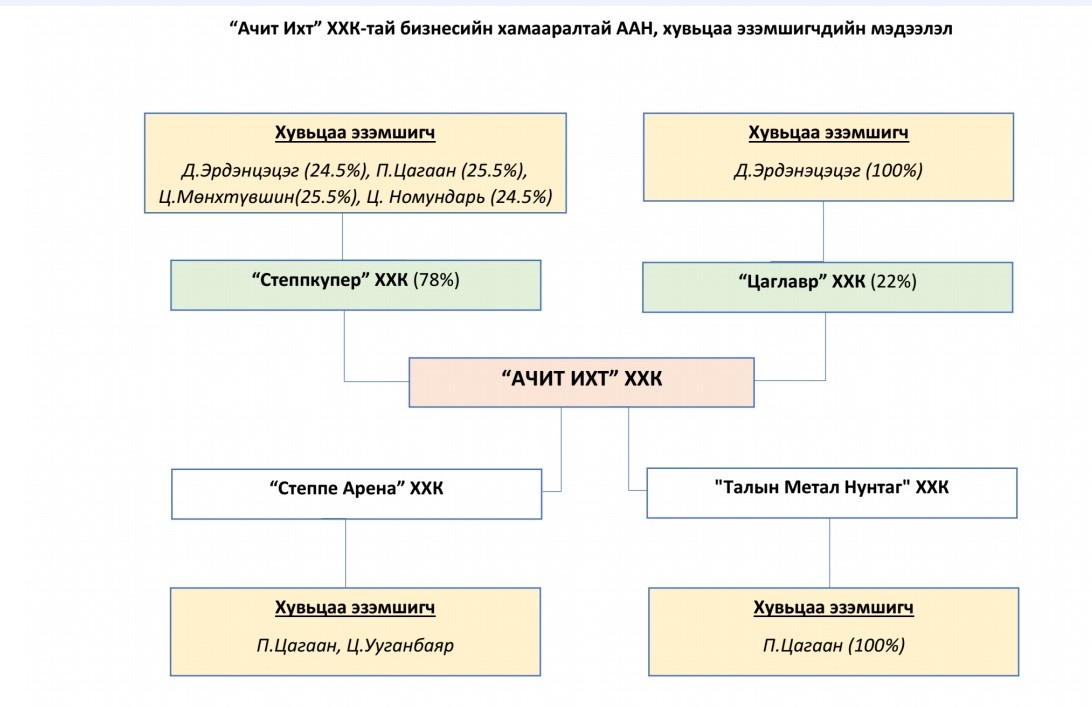 “Ачит ихт” компанийн тухайд Ерөнхийлөгч асан Ц.Элбэгдорж, түүний Тамгын газрын даргаар ажилаж байсан П.Цагаан нарын хамаарал бүхий компани гэж хэлж болно. Өдгөө П.Цагааны эхнэр, хоёр хүүгийн нэр дээр байдаг. Жилдээ 100 гаруй тэрбум төгрөг, сардаа 10 орчим тэрбум төгрөгийн ашигтай ажилладаг компани.