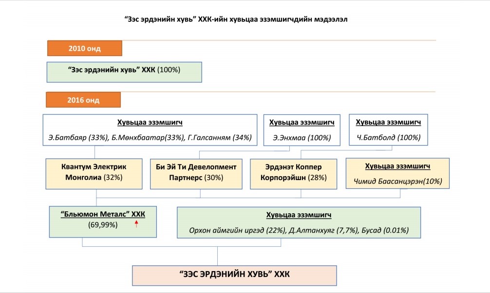 Анх тус овоолгыг "Зэс эрдэнийн хувь" ХХК-д өгөхөд Эрдэнэтийн 24500 иргэн тус компанийн 74 %-ийг эзэмшдэг байсан бол өдгөө 24500 иргэн 22 хувь болж буусан аж. Харин эрх мэдэлтнүүд 70 %-ийн хувьцааг нь эзэмшихийн зэрэгцээ тус компаниас олох ашгийг 70 хувийг хүртсээр байна.