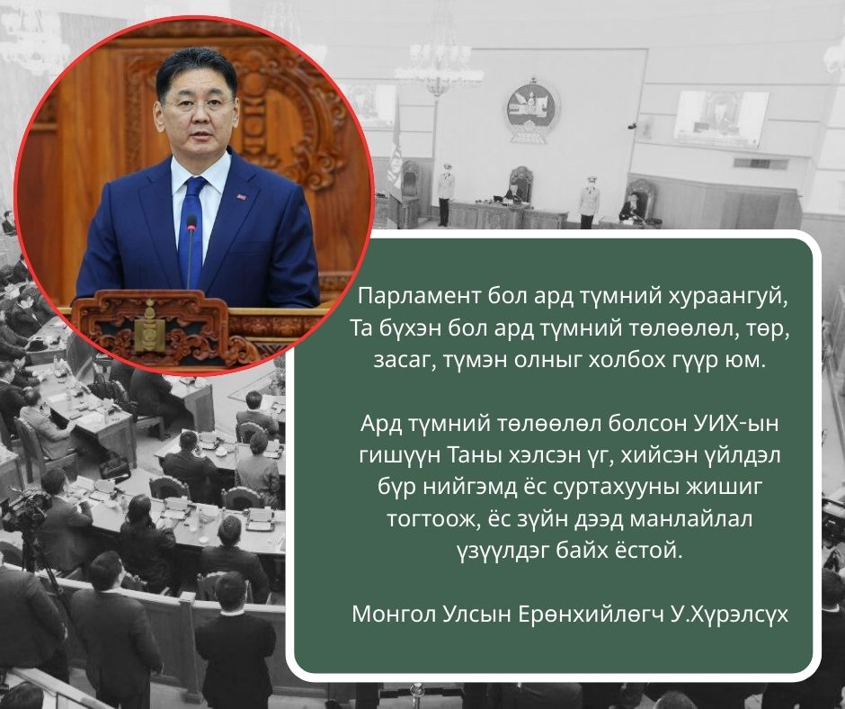 Ерөнхийлөгчийн хэлсэнтэй иргэд сонгогчид адилхан саналтай байгаа. УИХ бол авлига, албан тушаалын гэмт хэрэгт холбогдогсдын орогнох газар, УИХ-ын гишүүний дархан эрхээр халхавчилж үлддэг газар байх ёсгүй. Хууль хүн бүрийн өмнө тэгш үйлчлэх зарчмын хүрээнд УИХ-ын гишүүн ч гэсэн хариуцлага алдсан бол хариуцлагаа хүлээдэг тийм ШУДАРГА ЁСЫГ ард иргэд хүлээж байна.