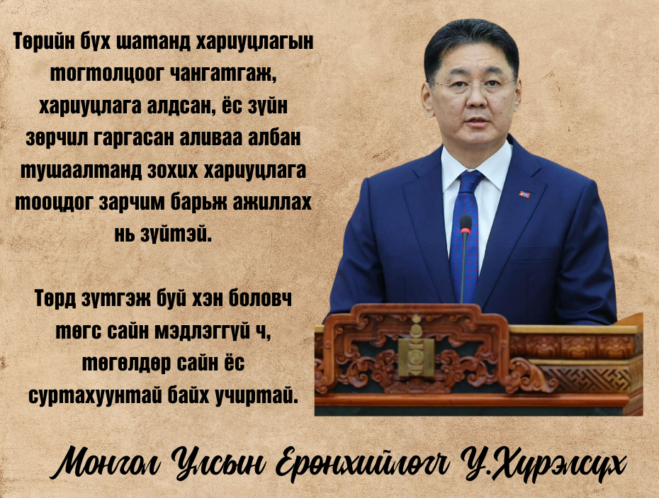 Тэгвэл өчигдөр Монгол Улсын Ерөнхийлөгч У.Хүрэлсүх УИХ-ын хаврын чуулганы нээлтэнд орж хэлсэн үгэндээ “...Төрийн албаны бүх шатанд сахилга, хариуцлага, ёс зүйг дээдэлж, хариуцсан ажилдаа эзний ёсоор хандаж, хийрхсэн улс төр, хэрүүл тэмцлээс ангид байж, бүх шатны төрийн байгууллагын хүнд суртал, бүтээмжгүй байдлыг халж, иргэндээ ээлтэй, нийгэмдээ үлгэр дуурайлалтай төрийн албыг бэхжүүлэх нь нэн шаардлагатай байгааг онцлон, Төрд зүтгэж буй хэн боловч төгс сайн мэдлэггүй ч, төгөлдөр сайн ёс суртахуунтай байх учиртай”-г анхаарууллаа.