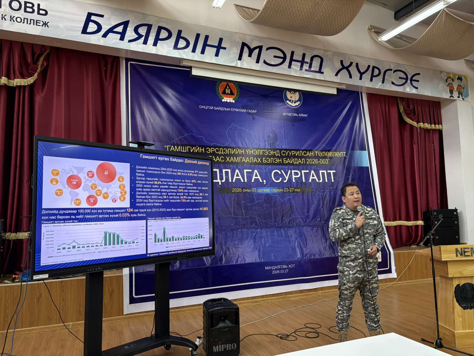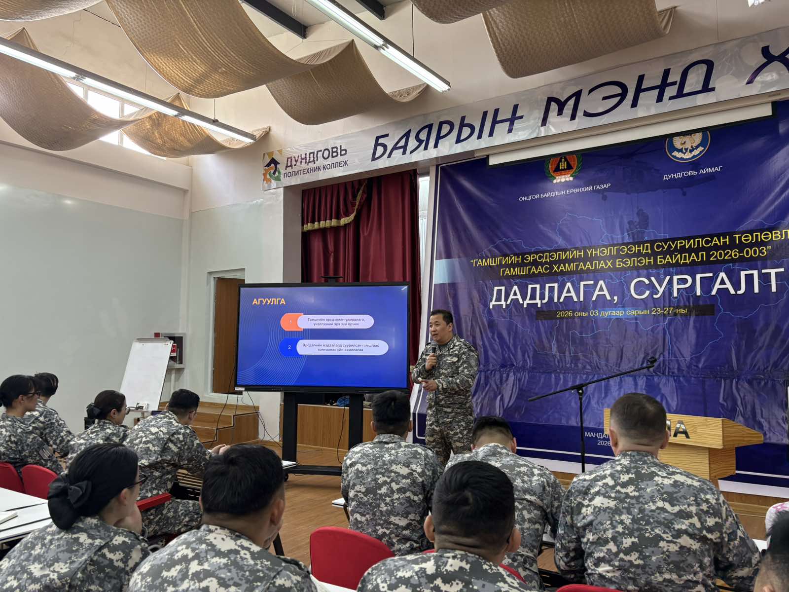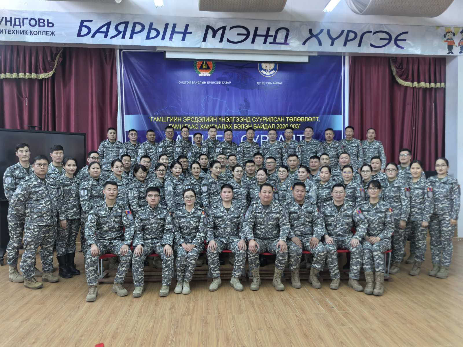 Монгол Улсын Засгийн газрын 2026 оны 01 дүгээр сарын 14-ний өдрийн 11 дүгээр тогтоолоор “Монгол Улсын гамшгаас хамгаалах төлөвлөгөө”-г шинэчлэн батлуулсантай холбогдуулан ОБЕГ-ын Ажиллагааны удирдлагын газар, Эрсдэлийн удирдлагын газартай хамтран “Гамшгийн эрсдэлийн үнэлгээнд суурилсан ба гамшгаас хамгаалах бэлэн байдал 2026-003” сэдэвт дадлага, сургуулийг Дундговь аймагт зохион байгуулж байна.